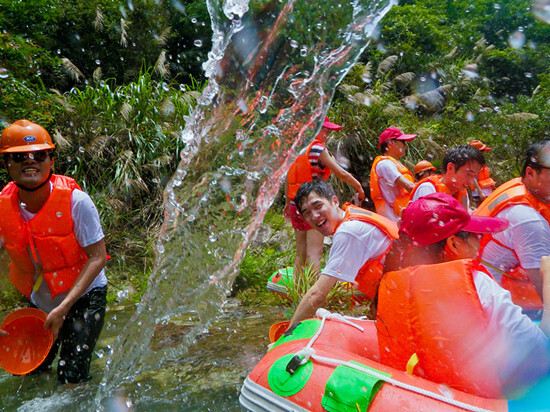 清涼水花飛濺引來(lái)女生們的聲聲尖叫,男生們則吼著嗓子大喊爽快。崎嶇的漂流水道驚險(xiǎn)刺激,橡皮船橫沖直撞,險(xiǎn)些卡在突起的石塊中間,很快就被后續(xù)飛沖下來(lái)的橡皮船撞開(kāi),猶如一場(chǎng)激烈的水上碰碰車(chē)大戰(zhàn)。每到一個(gè)水流平穩(wěn)的地方,部分男同事棄船蹲點(diǎn),準(zhǔn)備好滿滿的水,等待著被水流沖下來(lái)的同事展開(kāi)密集的潑水攻勢(shì),女生們力氣不敵男生最終敗下陣來(lái)舉白旗投降,有些男同事奮起對(duì)戰(zhàn)猛烈潑水,卻也因寡不敵眾輸?shù)脩K烈。