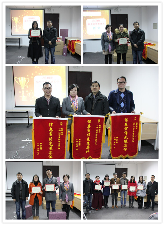 田園首先匯報集團2014年度文化宣傳工作,介紹了季刊、中英文月報、周報、網站、微信等集團自媒體發展情況、編委構成、年度業績,公布了各部門、子公司以及通訊員2014年度來稿數量、積分和獲獎情況。2014年,編輯部共收到各類稿件1067篇,比上年增長178%。賽爾國貿、優景進出口、優勝國貿投稿量位列集團前三,榮獲“信息宣傳先進集體獎”;周維維、王依偉等5人榮獲“最佳通訊員獎”,吳雅楠、胡躍東等10人榮獲“優秀通訊員獎”,周瑩獲得“最佳信息推送獎”,盧堂翠榮獲“最佳欄目編輯獎”。
