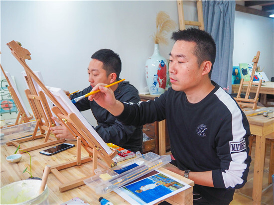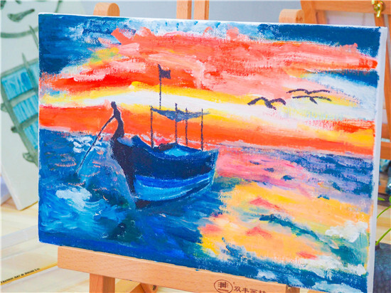 油畫一側(cè),畫架擺上,顏料備好,圍裙一系,專業(yè)的畫師模樣出來了!男老師畫畫真的比較罕見,這細致活需要耐心。經(jīng)過近2個小時的創(chuàng)作,一副副油畫作品出來了,寧波講師統(tǒng)一創(chuàng)作了“海上帆船”,沒有對比就沒有傷害哦。義烏講師就各顯神通了:有爸爸和媽媽和女兒一起創(chuàng)作的最紅社會人“小豬佩奇”;有自創(chuàng)作品“書香四溢”,出自桂東東老師之手,簡約卻不失神韻哦!