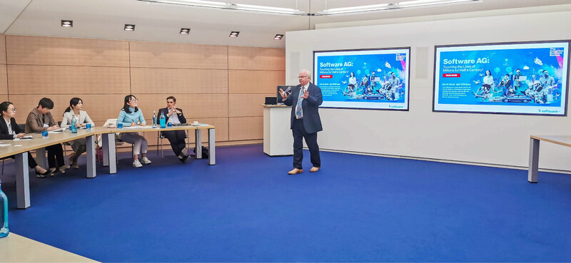 Software AG公司國際媒體事務總監(jiān)Paul Hughes先生接待了游學團一行,他簡要介紹了公司發(fā)展史,Paul Hughes先生在SAG公司工作了28年,也讓團員們心生敬意。