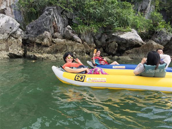 行程上的第二天,卻是真正游玩開始的第一天。一早出發(fā)前往素有海上小桂林之稱的:攀牙灣,出發(fā)時(shí)天氣晴朗,氣溫雖高,但伴著迎面吹來的海風(fēng),絲毫沒有感覺到悶熱,第一天就乘香蕉船出海,難以抑制心中的小激動(dòng),看的出來大家都滿懷期待,而沿途的美景也確實(shí)沒讓我們失望。