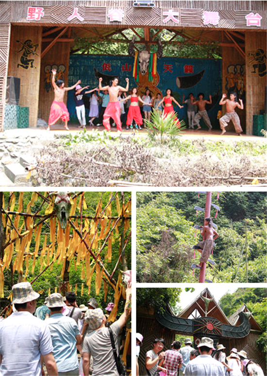 走出鬼城,眼前豁然開朗,“野人谷”三個大字映入眼簾。由阿佤山寨、圣水屋、恐怖地帶、迎賓區、野人舞蹈、特技踩玻璃、上刀山、跳火舞等節目組成的另類景色,返璞歸真的原始森林部落讓人有如世外桃源一般。
