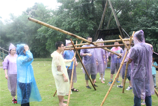 第二個團體游戲是搭過山車。過山車的軌道是簡易的PVC管搭建而成,管跟管之間用繩子,膠帶互相纏繞加固。在宏大橋梁工程面前,這些剛剛球場里揮汗如雨,大雨里大戰水球的男士們突然變成了“老練”的建筑家。在搭建的時候,他們給與了很多建設性意見。