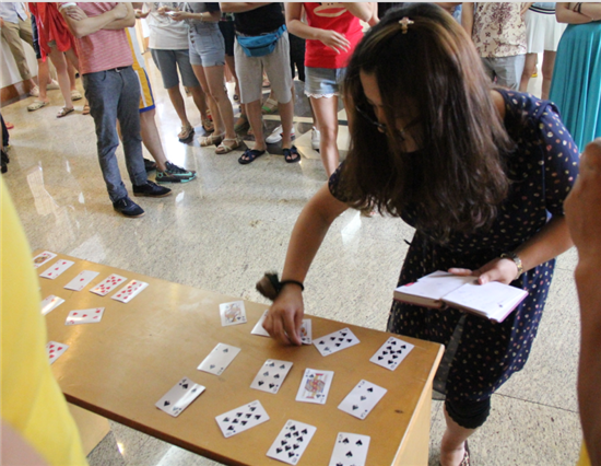 換了干凈的衣服,喝了姜茶,雖然歷經大雨洗禮,下午場又滿血復活。由于天氣原因,下午場改為室內活動。第一個游戲就是考驗智慧和團隊配合的游戲---達芬奇密碼。幾張撲克牌隨機打亂,在桌子上背面排開。每個隊伍依次出一人看一張牌,并且記住牌,最后有一個人需要按順序無差錯的翻出所有的牌才算游戲完成,用時最短者獲勝。
