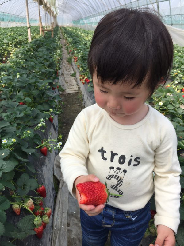 燒烤剛結束,摘草莓的消息不脛而走。大家趕緊集合起來,各自領兩個小籃子,目標直指那一簇簇雪白的草莓大棚。盡管棚里非常悶熱,但就像那首歌唱得“沒有什么能夠阻擋”,看著腳邊那一個個紅彤彤的大草莓,忍不住先摘幾個解解饞,你問好不好吃?看看咱們的小公主就知道了!