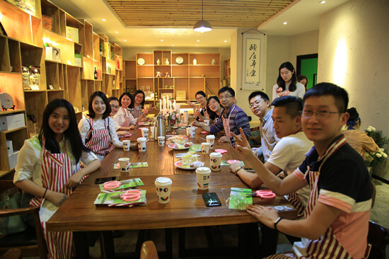 下午2點,寧波的講師們來到了一家咖啡廳,咖啡廳的走廊里,就看到了一塊我們公司專屬插花課畫報,畫報一旁,簇擁著各式品種的花,淡淡的花香撲面而來,沁人心脾,美麗的心情溢于言表。走進咖啡店,花藝師早已為大家準備好了插花素材:布,剪刀,絲帶等,整整齊齊地放在桌面上。講師們陸續到齊,帶上圍裙,點上蠟燭,一邊聽年輕美貌的花藝師講解花的品類,一邊跟著剪枝修葉,動起手來。花朵妖嬈盛放,講師們聽著音樂,品味下午茶,打點著自己的DIY花束,是一種享受,更是一種藝術的熏陶。有趣的是,插花活動里驚現4名男講師,他們可有自己一門小心思呢,等著包好花回家給老婆(女友)大人獻殷勤!
