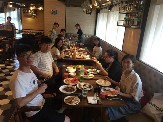 下午五點,大部隊前往夏威夷海鮮自助酒店,來一場適合發(fā)朋友圈的晚餐。我們?yōu)椴荒艹院ur的莎莎計算要吃多少個哈根達斯才能回本,食物中毒的松哥只能看著我們大口吃肉然后默默喝粥,還發(fā)現(xiàn)了能吃幾盤海鮮+超大塊牛肉+N多水果的五部大胃王——周曉東同學(xué)。最后,秉著不能浪費食物的我們,開始了繞口令游戲,說錯的就要吃一筷子,不多會兒,桌上的菜就在灰化肥、紅鯉魚、八百標兵中全部消滅光了。