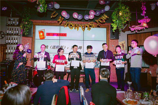 會議結束之后,大家陸續抵達龐客酒吧,酒過三巡,主持人錢青和周慧,步入舞臺中央,拉開了2017年優景小年夜的帷幕。此次小年夜的主題是:奮斗路上,我們永遠十八!第一個節目是新人報道,2017年新進員工一一亮相作自我介紹,通過才藝展示和趣味游戲,讓大家對新同事有了更全面的了解。接下來的各色互動小游戲,讓臺下的同事笑得前仰后翻。