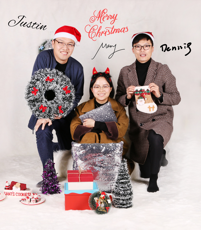 我們利用圣誕花環(huán)、圣誕樹、圣誕襪、圣誕擺件等各類節(jié)日裝飾品,以白色絨布為背景,打造了一個溫暖喜慶的布景。隨后按照公司各個小組的順序,以重要客戶為對象,進行不同的序列組合拍攝團體照。另外,我們還收集了每一位業(yè)務員的英文電子簽名,標注在每個人照片旁邊,以便給客戶留下更深刻的印象。拍完照之后,我們在上面加上了祝福語和親筆電子簽名,最后制作出了一張張別出心裁的精美圣誕節(jié)專屬賀卡。