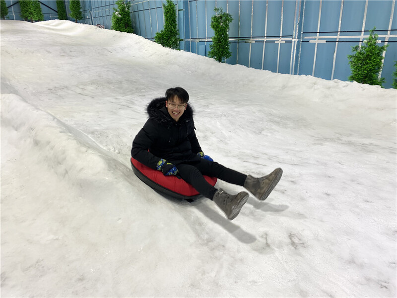 我們早早地驅車前往團建的第一站——愛上義烏的夜。考慮到大家的參與性,我們一致選擇滑雪項目。每個人都興沖沖地牽著“座駕”走上滑雪道的起點,伴隨著興奮又害怕的尖叫聲沖下滑道。除了滑雪之外,當然還得打一場雪仗才不虛此行。