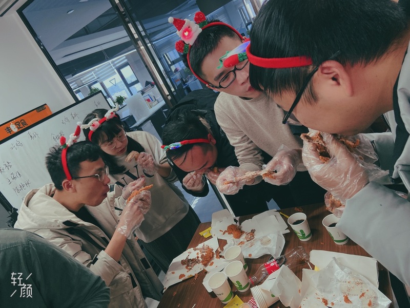 為了舒緩大家緊張的工作氣氛,優訊四部在圣誕節這一天策劃了“德智體”全面發展的圣誕比拼小游戲。在第一輪的“吃雞大戰”,每組必須在最短時間內暴風吸入一只炸雞,此時的男士們充分展現了自己的優勢。