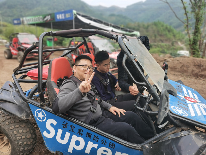 到達蕭皇巖景區后,大伙立馬趕去越野車項目基地,這是大家心馳神往的項目。一番討價還價后,兩兩組隊進行騎行。剛確認騎行順序,第一輛車就消失在視野,越野車的轟鳴聲像是燃起了大家的熱血,車子魚貫而出。凹凸不平的路面對車身造成巨大沖擊力,在劇烈的顛簸中,緊張與興奮交雜,工作的壓力和煩惱蕩然無存。