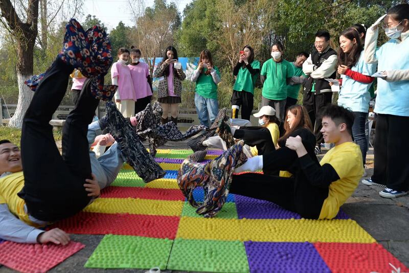 偌大的場地,繽紛的游戲,指壓板、撕名牌等綜藝中能看到的游戲應(yīng)有盡有,同事們奉獻(xiàn)一場精彩的“奔跑吧”決戰(zhàn)。大家通過抽取名牌的方式隨機(jī)分成4組,熟悉組員后便開始激烈的游戲。首先進(jìn)行指壓板上穿花褲和計步器跳舞,每支隊伍在指壓板上合格地穿上花褲盡情跳舞,最后憑借計步器上的最終數(shù)字確定勝者。指壓板上,大伙兒瞬間貢獻(xiàn)出無數(shù)個表情包,引得周邊群眾一片笑聲。愛的魔力轉(zhuǎn)圈圈中,要求隊伍在不用手的情況下,將纏繞在身上的布條轉(zhuǎn)移到下一名隊員身上,用時最短的隊伍獲勝。隨后進(jìn)行的音樂競跑和叢林冒險環(huán)節(jié)里,幾支隊伍互有勝負(fù),不相上下。