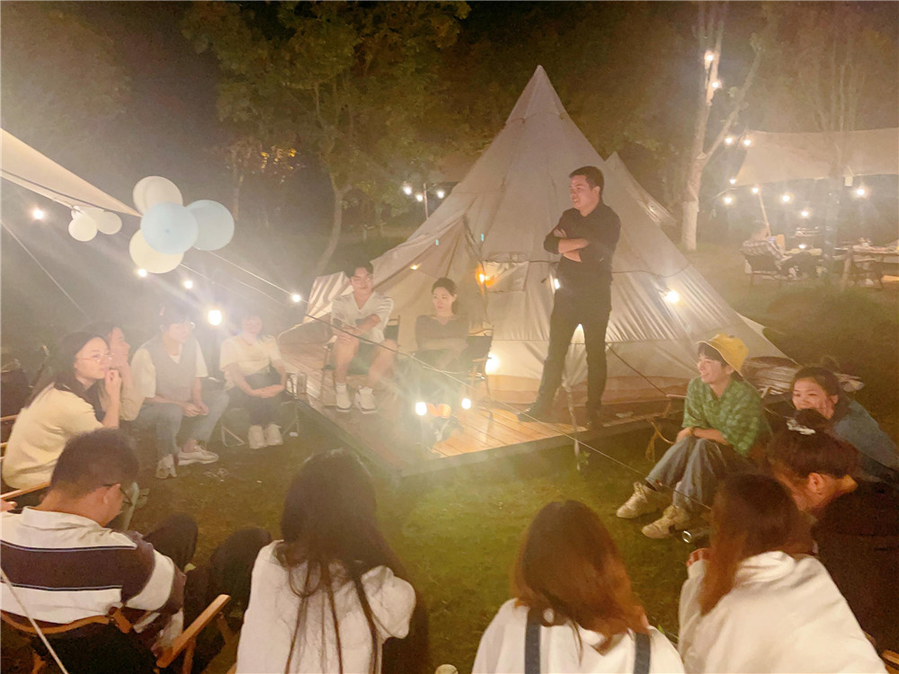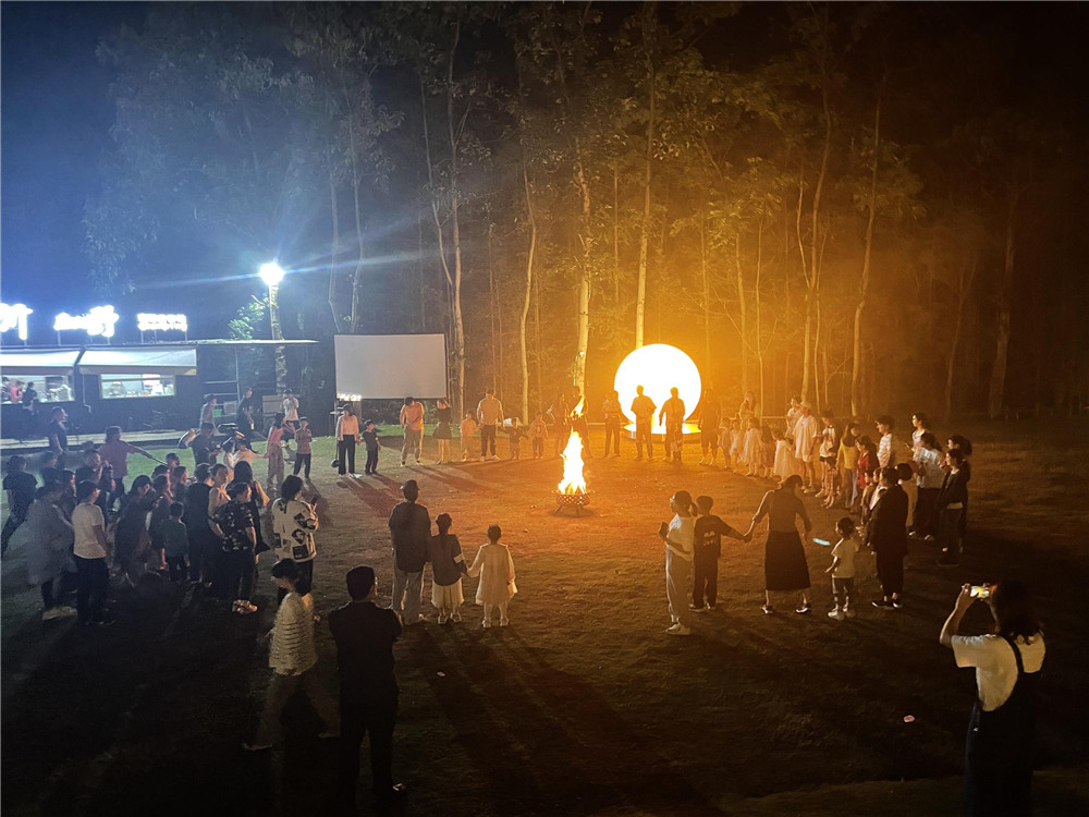 一到目的地,首先映入眼簾的是高聳的水杉竹林,再往里走便是有序的帳篷群,場地中心正播放著露天電影。爐具、食材已準備就緒,大家立即開啟了火鍋+烤肉的自助餐模式。晚上還有煙花秀和戶外KTV,“星河”漫天,余音繞梁。人間煙火氣,最撫凡人心。