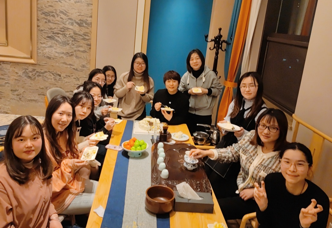 傍晚時分,小伙伴們紛紛抵達聚餐地。不一會兒,桌上便擺滿了各種各樣的美味佳肴。我們吃著聊著笑著,享受著這團聚的溫馨和快樂。晚餐過半,我們拿出了今晚的重頭甜點——蛋糕。一朵朵奶油玫瑰花點綴在蛋糕上,周圍一圈綠色裝飾,宛如一束鮮花。接著,大家點亮蠟燭,在燭光中紛紛許下最美好的祝愿。大家用手機拍照留念,記錄這珍貴的一刻。在晚餐的最后,謝總號召我們舉杯,祝綠時女神們永遠年輕、永遠18。在叮叮當當的干杯聲中,歡快的女神節聚餐逐漸走向尾聲。