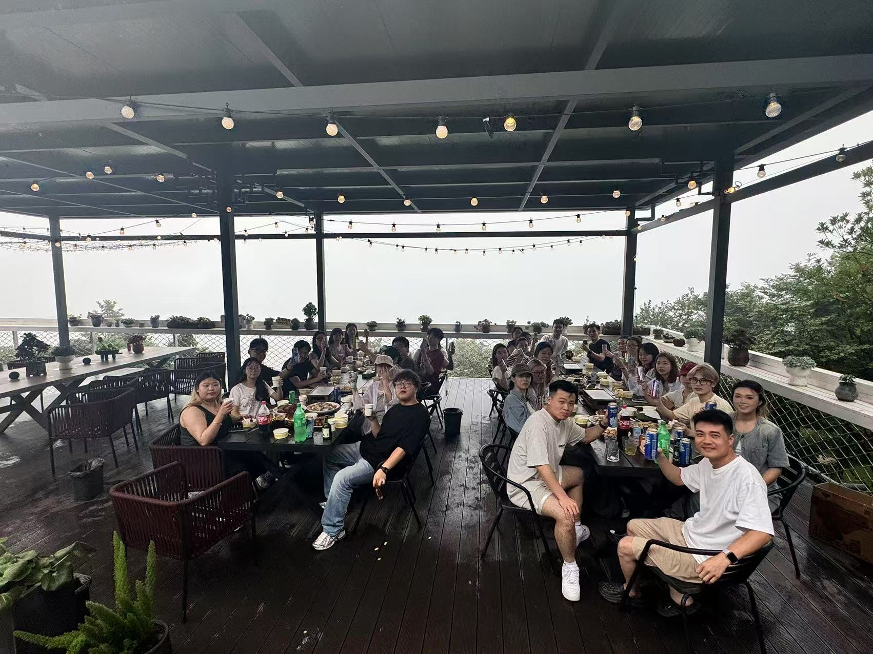 山風(fēng)漸涼時,雨聲淅淅瀝瀝。天空一聲巨響,采購部頭號一姐拿著麥克風(fēng)跟著駐場的鋼琴手開始show time,一首清美悠揚的歌聲驟然響起,為晚餐拉開了完美的序幕。長桌上擺滿了熱氣騰騰的菜肴,冰鎮(zhèn)的啤酒與飲料冒著細密的氣泡,大家圍坐在一起,邊吃邊聊。舒緩的旋律在山間流淌,混著飯菜的香氣與大家的談笑聲,格外愜意。