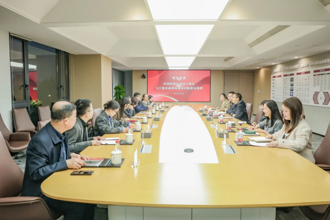 11月25日下午,中國紡織品進出口商會曹甲昌會長、會員部副主任苗青芳等一行來賽爾集團走訪調研。寧波市商務局黨組副書記、副局長、二級巡視員韓雋、市商務局貿促處處長張陽松、貿促處副處長馬建萍等陪同調研,賽爾集團董事長徐平炬、副董事長聯席總裁陳勇珍、總裁助理馬科成、集團行政副總經理方芳、優勝公司副總經理張怡和業務副總監胡穎等熱情接待。